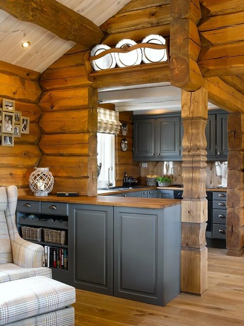Модернистский стиль подойдет для тех, кто предпочитает современные технологии и минимализм. Гладкие поверхности, прямые линии и металлические акценты в сочетании с деревянными элементами создают интересный контраст. Кухня в стиле модерн будет выглядеть современно и стильно, сохраняя при этом естественный шарм деревянного дома.