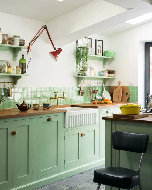 2. Эстетическая привлекательность: зеленая кухня без верхних шкафов выглядит современно, стильно и необычно, привлекая внимание и создавая уникальный интерьерный акцент.