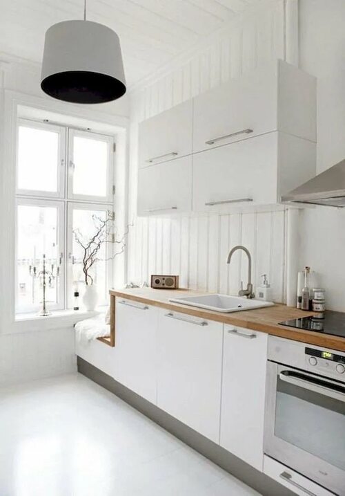 1. Визуальное увеличение пространства. Белый цвет визуально расширяет помещение и делает его более просторным, что особенно ценно для небольших кухонь.