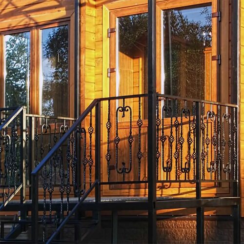 Вторая фотография показывает классическое металлическое крыльцо с изящными ковками и узорами. Этот стильный дизайн добавляет шарма и роскоши к фасаду дома.