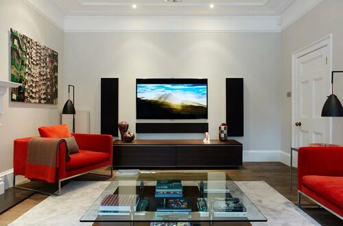 Выберите место, где телевизор будет хорошо виден из разных точек зала. Учтите угол обзора и расстояние от дивана или кресел до экрана.