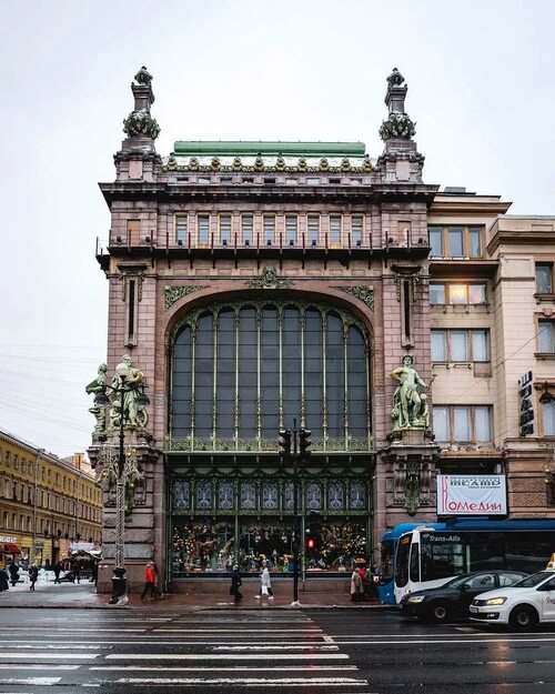 Одна из самых узнаваемых фотографий Дома купцов Елисеевых, на которой запечатлен великолепный фасад здания.
