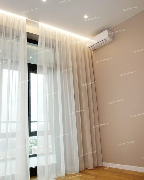 Встроенная гардина добавляет элегантности и стиля вашему интерьеру. Она позволяет создать гармоничное сочетание цветов и фактур между потолком и шторами, что придает помещению завершенный вид.