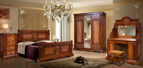 2. Модель "Элегия": этот спальный гарнитур в классическом стиле выполнен из МДФ с декоративными элементами из шпона. Он включает кровать с изящной спинкой, шкаф с распашными дверцами и комод с зеркалом.