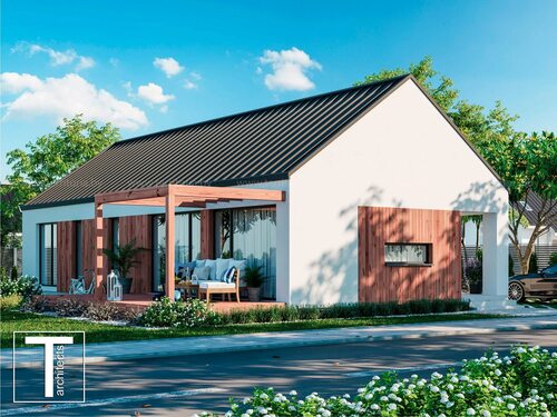 Этот проект представляет собой уютный одноэтажный дом с двускатной крышей, идеальный для загородной жизни. Он имеет большие окна, которые позволяют максимально использовать естественный свет, а также просторную террасу, где можно насладиться прекрасными видами природы. Внутри дома создана атмосфера уюта и комфорта, что делает его идеальным местом для отдыха и релаксации.