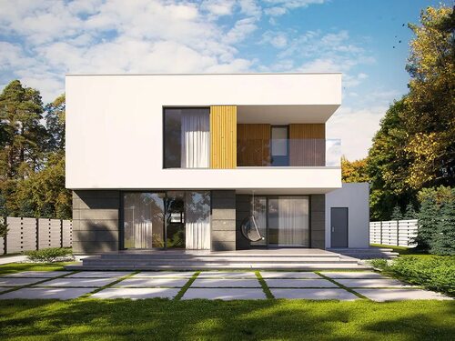 Этот проект представляет собой стильный и современный дом с плоской крышей. Он отлично сочетает в себе простоту и функциональность, а также обладает большим количеством окон, что обеспечивает естественное освещение внутреннего пространства. Фасад дома выполнен из пеноблоков, что придает ему современный и элегантный вид.