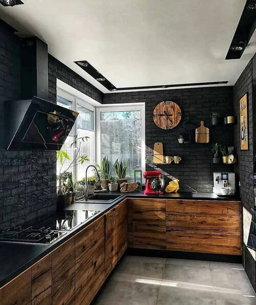 Черную кухню в стиле лофт можно сочетать с другими цветами, чтобы создать более яркий и живой интерьер. Например, можно использовать деревянные элементы или яркие акценты в виде красных или желтых предметов интерьера.