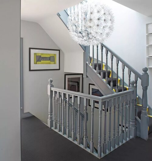 3. Фортепианная лестница с серыми ступенями и белыми балясинами