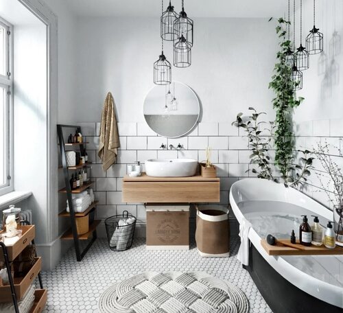Не забывайте и о деталях - зеркала, полки, коврики и другие аксессуары могут стать ярким акцентом в ванной комнате в скандинавском стиле.