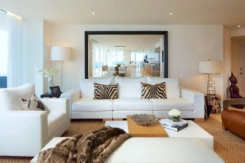 Если вы хотите создать необычный и запоминающийся интерьер, попробуйте создать галерейную стену зеркал над диваном. Это может быть комбинация зеркал разных форм и размеров, которые образуют стильный и элегантный композиционный элемент. Вы можете играть с различными формами - круглыми, прямоугольными, овальными и т. д., чтобы создать уникальный и гармоничный образ.