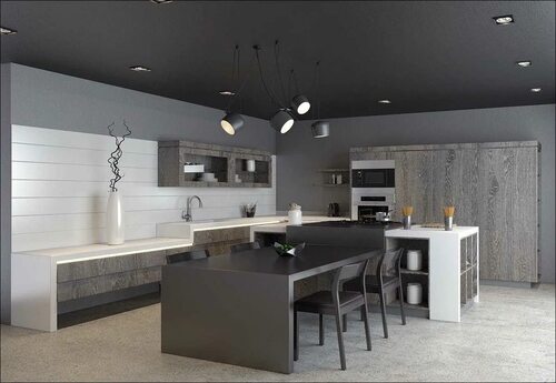 Столешница и фурнитура могут быть выполнены в контрастных цветах, чтобы добавить интересных акцентов и разбавить серую палитру. Также не забудьте про освещение - установите современные светильники, которые подчеркнут стиль вашей кухни.