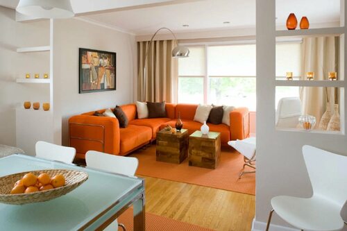 Скандинавский стиль интерьера отлично подходит для создания светлого и уютного пространства. Оранжевый диван может стать ярким акцентом в скандинавском интерьере. Выберите диван с нежными оттенками оранжевого цвета, чтобы сохранить светлую атмосферу помещения. Добавьте текстильные элементы, такие как пледы и шторы, в нейтральных тонах, чтобы создать гармоничную композицию.