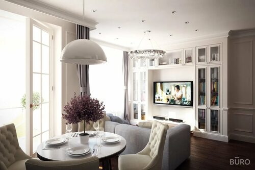 При выборе цветовой гаммы для гостиной столовой в хрущевке, предпочтение лучше отдать светлым оттенкам, которые визуально расширят пространство. Освещение играет важную роль в создании комфортной атмосферы. Рекомендуется использовать несколько источников света, включая потолочные люстры, напольные и настольные лампы.