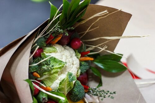 Попробуйте создать букет, используя только овощи. Можете использовать разноцветные морковки, редис и перец, чтобы добавить яркости и оригинальности.