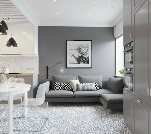 Одна из основных составляющих дизайна квартир в сером цвете - это стены и потолок. Вы можете выбрать однородное покрытие или создать интересный фон, используя различные оттенки серого. Декоративные элементы, такие как фрески или молдинги, также могут добавить изысканности и элегантности в интерьер.
