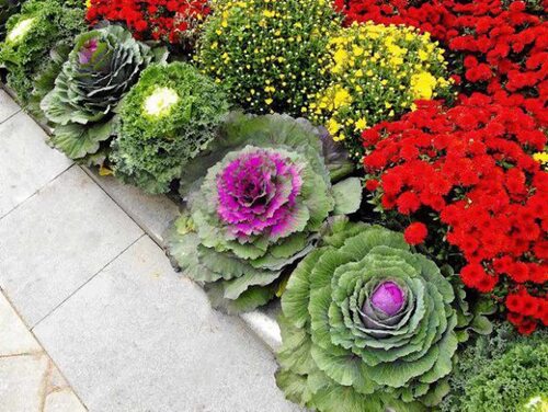 Для вдохновения предлагаем вам посмотреть некоторые примеры дизайна клумб из декоративной капусты: