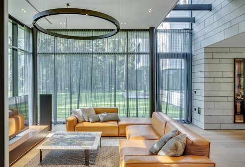 - Естественный свет: Панорамные окна позволяют заполнять гостиную светом, делая ее более светлой и приветливой. Естественное освещение также может создать впечатление большего пространства.