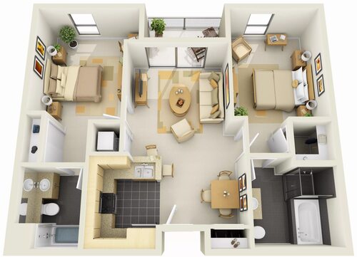 При выборе мебели и аксессуаров для интерьера вид сверху обратите внимание на их размеры и форму. Они должны быть пропорциональными и гармонично сочетаться друг с другом. Используйте мебель с прозрачными или открытыми элементами, чтобы не загромождать пространство. Также обратите внимание на цветовую гамму - выбирайте тона, которые будут сочетаться с общим стилем интерьера.