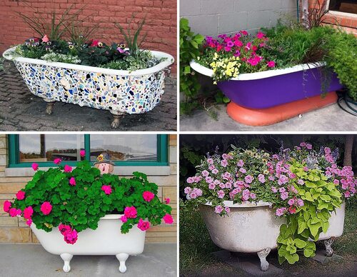 Превратите старую ванну в оригинальный цветочный горшок. Заполните ее землей, посадите цветы или растения, и вы получите яркий и необычный элемент декора для своего сада или веранды.