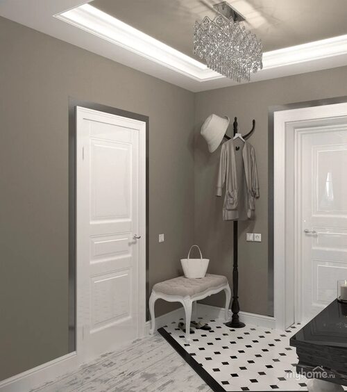 Для добавления текстуры и интересных деталей можно использовать обои с геометрическими узорами или серую керамическую плитку с рельефным рисунком. Важно помнить, что отделка стен и пола должна быть прочной и легко чиститься, так как коридор является проходным помещением.