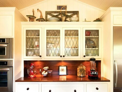 4. Шкафы с витражами. Шкафы с витражами - это классическое и изысканное решение для кухонного интерьера. Витражи добавят шарма и элегантности вашей кухне, а также позволят выставить на показ красивую посуду или коллекцию столовых приборов.