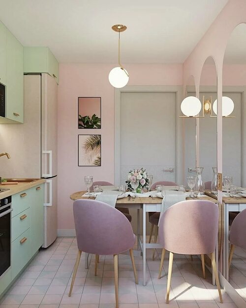 Основными цветами для нежного интерьера кухни являются пастельные оттенки, такие как светло-розовый, мятный, голубой или лавандовый. Эти цвета добавляют мягкости и нежности в помещение. Вы можете использовать их на стенах, мебели и аксессуарах.