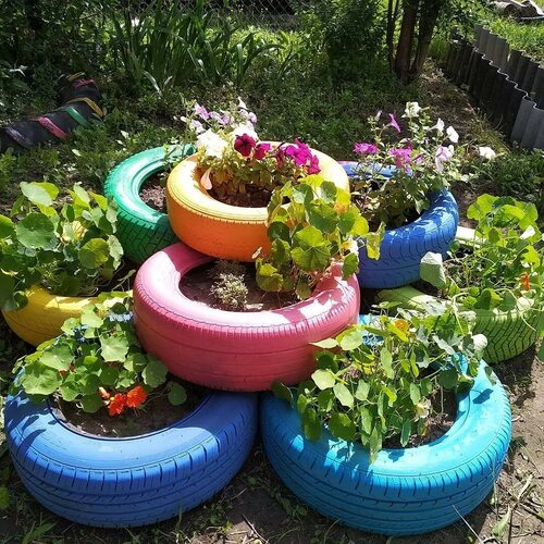 Старые автомобильные шины могут стать отличным материалом для создания клумб. Вы можете выложить их в ряды или стопку, заполнить землей и посадить цветы. Шины можно покрасить разными яркими цветами, чтобы добавить клумбе еще больше яркости.
