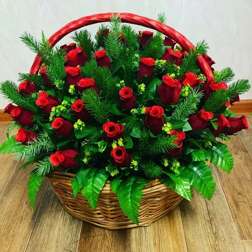Красные цветы символизируют страсть, силу и любовь. Они могут быть использованы в корзинах для выражения глубокой привязанности и уважения к ушедшему.