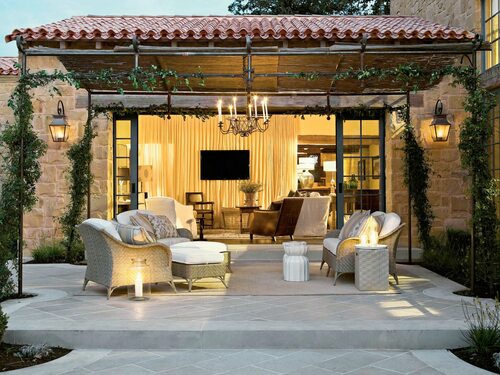 Классическая веранда патио характеризуется использованием натуральных материалов, таких как дерево и камень. Здесь можно создать атмосферу роскоши и элегантности, добавив мебель из ротанга или кованого железа.