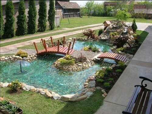 Оформление пруда с мостиком