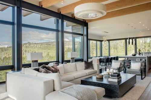 Вот пример загородного дома с окнами с полным остеклением. Здесь каждое помещение обладает великолепным видом на окружающий пейзаж, что создает ощущение единства с природой.