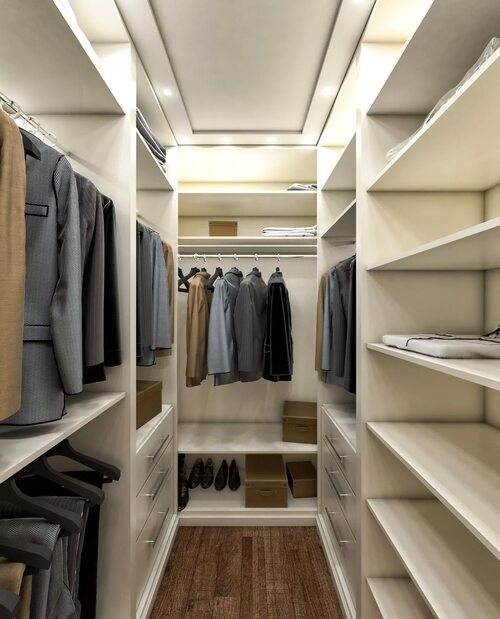 Один из самых распространенных способов организации гардероба в кладовке - это установка штанг и полок. Вы можете использовать вертикальное пространство для вешалок и горизонтальное - для складывания одежды и аксессуаров. Обратите внимание на примеры, где штанги и полки размещены на разных уровнях для удобства использования.