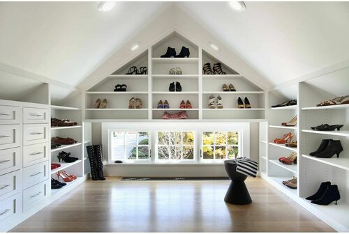 Открытые полки - это отличный способ организовать и показать вашу обувь. Установите полки вдоль стены или под скатами крыши, чтобы сэкономить место и создать стильный акцент в гардеробной.