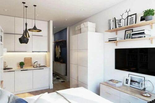 В студии 13 кв. метров важно максимально оптимизировать пространство для хранения вещей. Используйте вертикальные поверхности, например, ставьте полки до потолка или используйте подвесные системы хранения. Также можно использовать мебель с встроенным хранением, такую как кровать с выдвижными ящиками или шкаф с раздвижными дверцами.