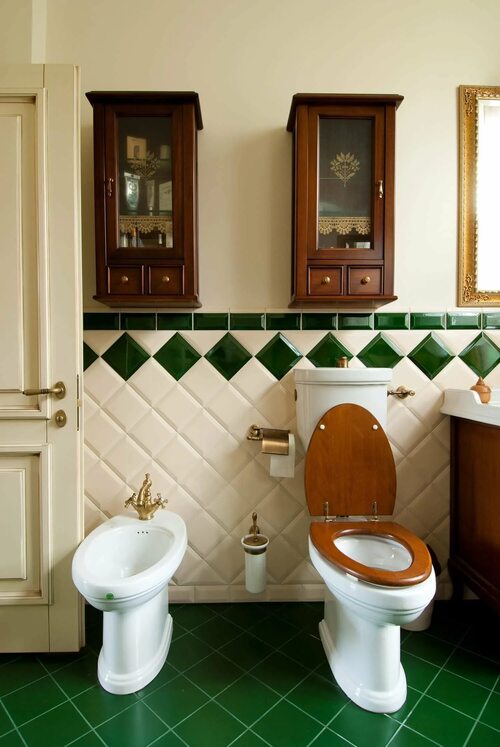 Один из самых элегантных способов внедрения зеленого унитаза в интерьер туалета - это комбинирование его с мраморной отделкой. Мраморные панели на стенах и полу создают роскошную атмосферу, а зеленый унитаз становится ярким акцентом среди нейтральных оттенков.