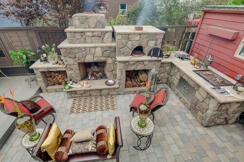 Зона барбекю с каменной кладкой и большим деревянным столом. Дополнительные сидения создают комфортное пространство для гостей.