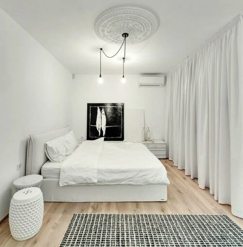 Белые стены и минималистический дизайн идеально сочетаются. Отказ от излишеств и лишних деталей поможет создать спокойную и гармоничную атмосферу в спальне. Используйте простые линии и минимум мебели, чтобы достичь элегантного и стильного интерьера.