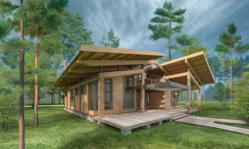 Этот проект представляет собой современный финский дом с баней и односкатной крышей. Он отличается простотой и функциональностью. Большие окна позволяют максимально использовать естественное освещение, а открытая терраса предлагает прекрасную возможность насладиться свежим воздухом и красотой окружающей природы.
