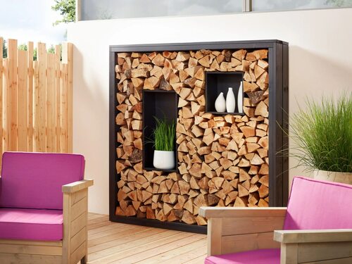 Разместите растения вокруг дровницы, чтобы создать приятную атмосферу и скрыть её от глаз посетителей.