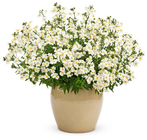Цветки немезии вегетативной имеют пятилепестковую форму и диаметр около 2-3 сантиметров. Они собраны в кистевидные соцветия, которые визуально создают эффект облачка над зелеными листьями. Растение обладает нежным ароматом, который приятно чувствуется вблизи.