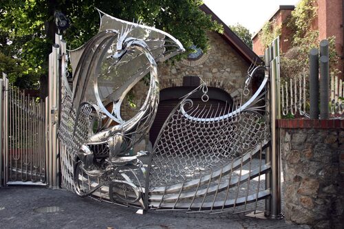 Эти ворота представляют собой настоящую фантазию, выраженную через ковку. Разнообразные узоры, геометрические фигуры и абстрактные элементы создают неповторимый образ, который завораживает своими формами и линиями.