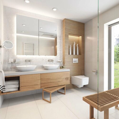 Теперь давайте рассмотрим несколько идей, как воплотить в жизнь ванную комнату в белом стиле с элементами дерева: