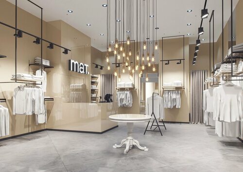 Освещение играет важную роль в интерьерах магазинов одежды. Хорошо продуманное освещение позволяет подчеркнуть детали одежды и создать уютную атмосферу. Магазины одежды обычно используют комбинацию различных видов освещения: общее освещение для равномерного освещения помещения, направленное освещение для подсветки товаров и акцентное освещение для выделения ключевых элементов интерьера.