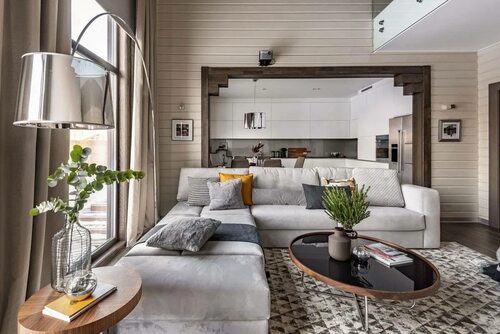 1. Фото интерьера гостиной в стиле лаундж с большим окном, мягким диваном и низким столиком.
