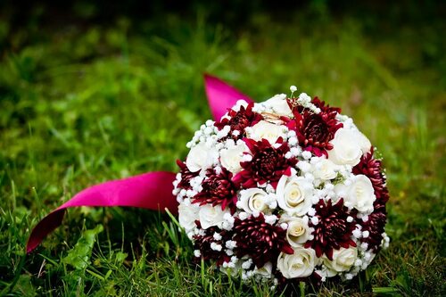 Важно подобрать букет, который будет гармонировать с цветовой гаммой свадьбы. Если ваша свадьба оформлена в стиле "бордовый с белым", то букет в этих цветах будет идеальным дополнением.