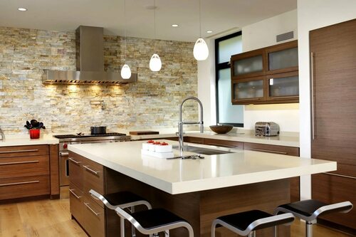 Натуральное дерево придает кухонному интерьеру особый шарм и теплоту. Панели из натурального дерева могут быть использованы для отделки всей стены или создания акцентной зоны. Они могут быть обработаны специальными средствами, чтобы защитить их от влаги и повреждений. На фото ниже представлены примеры использования панелей из натурального дерева в кухонной отделке.