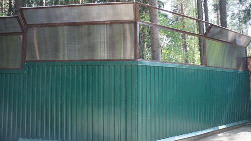 Эко-стиль в дизайне комбинированного забора из профнастила и поликарбоната основан на использовании натуральных материалов и нейтральных оттенков. Деревянные вставки или имитация дерева в сочетании с прозрачными панелями поликарбоната придают забору органичность и гармонию с окружающей природой. Такое ограждение станет идеальным выбором для тех, кто стремится к экологичности и уюту на своем участке.