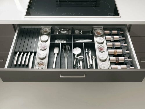Выдвижные ящики - это удобное решение для хранения посуды, кухонных принадлежностей и продуктов. Они позволяют легко организовать пространство внутри шкафов, делая все необходимые предметы доступными и удобными в использовании.