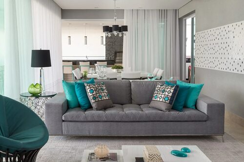 Для вдохновения предлагаем рассмотреть несколько примеров стильного сочетания бирюзового дивана и серого интерьера: