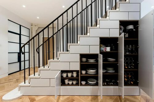 Если в вашем доме есть достаточно места под лестницей, вы можете создать небольшую гардеробную комнату. Установите штангу для вешалок, полки для аксессуаров и ящики для хранения мелочей. Это отличное решение для организации вашей одежды и аксессуаров и создания уютного пространства для подготовки к выходу из дома.